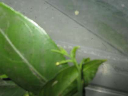 見つけたたまごは,大きさがちょうど1mmでした。(葉っぱの先についた黄色くて丸い形のものがたまごです。)