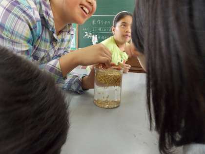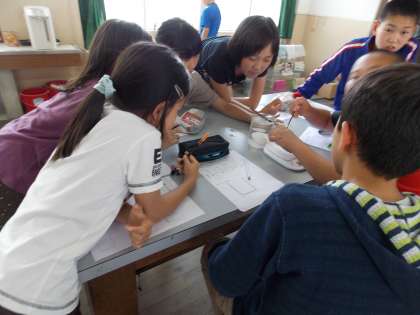 卵が丁度浮くくらいの濃さの食塩水に、昨年の5年生から引き継いだ種もみを浮かせました。中身が入っている良い種もみは重い!だから、沈んだものだけを分け、これから苗作りの準備に取り掛かります。