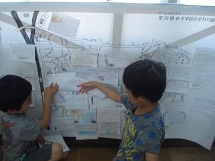今日は地域の地図に,自分たちのすきな場所の紹介を貼りました。