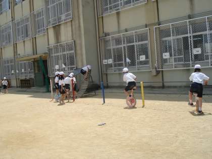 体育の学習で竹馬と一輪車の練習をしています。