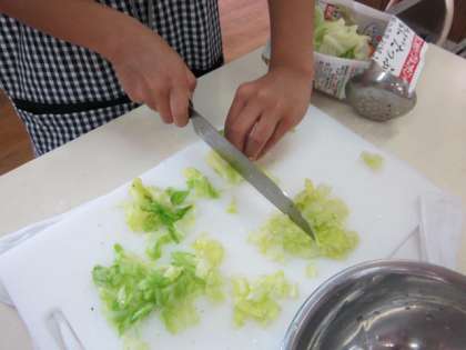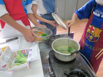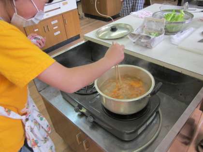 野菜のゆで加減を何度も確かめながら、おいしいゆで野菜を作りました。