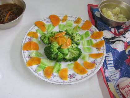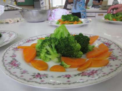 ゆで野菜をおいしく見せるため、盛り付けの工夫をしました。