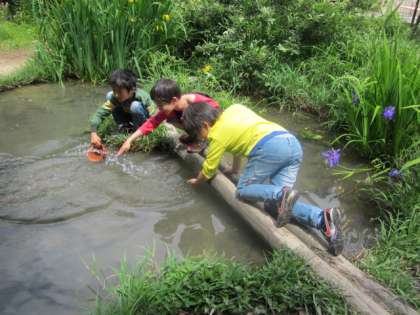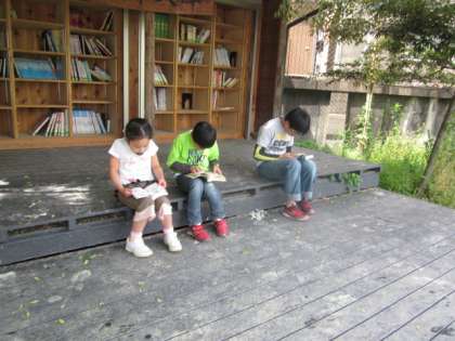 ビオトープでは、月澤文庫の本を読む子、池にいる子(たぶんザリガニを探してる)