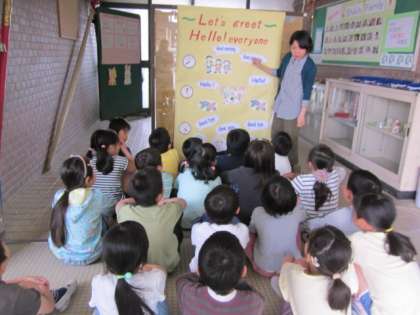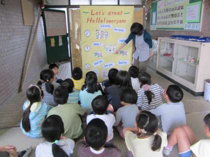 玄関にある英語の掲示物を使って、子どもたちに伝えています。