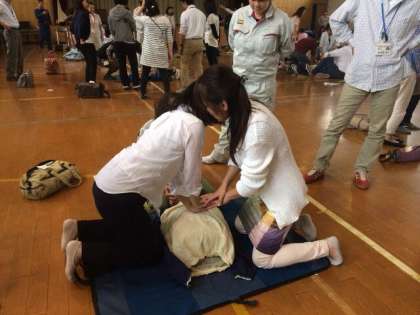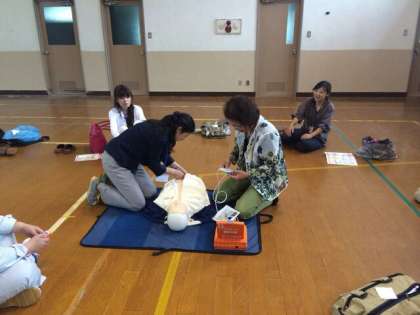 小グループに分かれて、人形を使って心肺蘇生法やAEDの使い方を習いました。