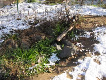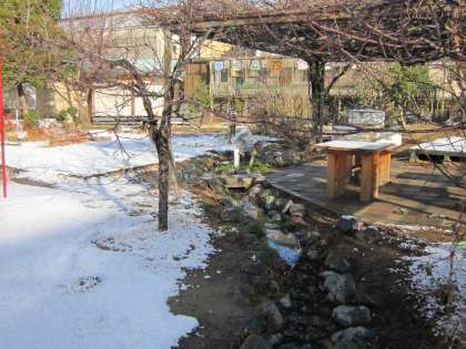 先日の積雪で,運動場は,一応真っ白になりましたが,ビオトープは,木があるので,白くなるところと,木に雪が積もるところとになります。
