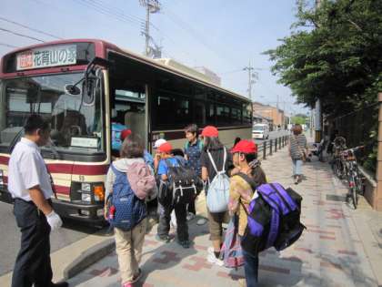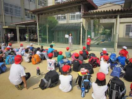 好天に恵まれ,運動場で出発式を行い,「花背山の家」に向けて元気に出発しました。4泊5日の長期になりますが,みんなが協力して活動や生活をしてくれることでしょう。この5日間で更に成長してくれることを願っています。