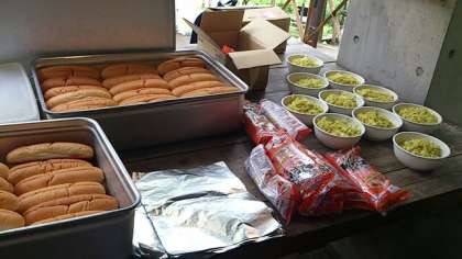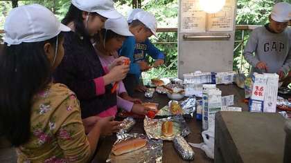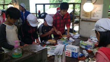 昼食のパックドックを作ります。山の家での最初の活動です。パンに炒めキャベツとウィンナをはさみます。