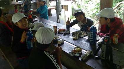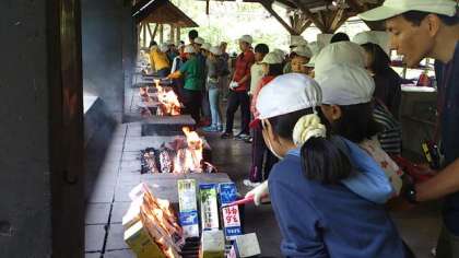 アルミ箔でパンを巻いて、牛乳パックに入れます。牛乳パックに火をつけて焼きます。ドックの出来上がり!