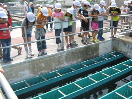 次は,沈殿池。さきほどのフロックを沈殿させてごみを池の底に集めて捨てているのだそうです(底の様子は目では見られないのですが)。