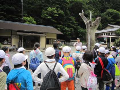 ふもとに到着しました。ほんとうにみんなよくがんばりました。今日の山登りを支えてくださった山の家の職員さんにお礼を言っています。