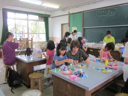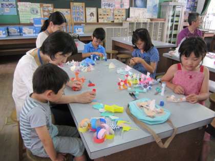 きれいな形のくす玉やかざりを教えていただき、親子で楽しく作っていました。