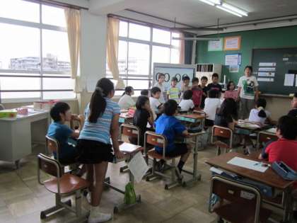 そのための前段階です。友だちと英語を使ってやりとりしています。そして、好きなものを発表しています。友だちが好きな物には、やはり興味があり、楽しんで活動していました。