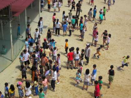 たてわりの「にこにこグループ」で外で遊ぶグループと教室での読み聞かせに分かれます。まず、6年生が1年生の教室へ行って、自分のグループの1年生を呼んできて始まります。外で遊ぶグループは、ドッジボールやおにごっこ、なわとびなどをしていました。