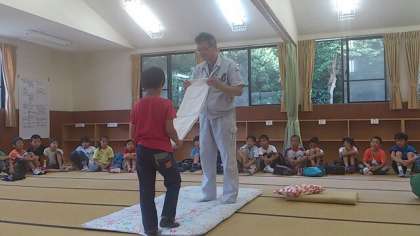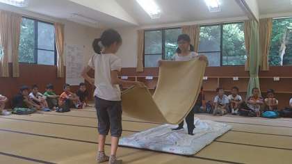 60畳の部屋で、施設の使い方、寝具、寝袋の使い方を教えていただきました。