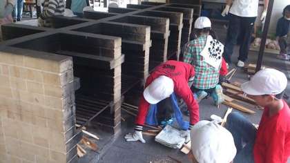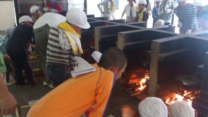 火をおこすのは、なかなか難しく、何度もやり直すグループもありました。教えてもらいながら、ようやくどの班もかまどの準備ができました。お鍋をおいて、ぐつぐつ煮えたら出来上がりです!