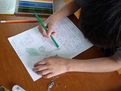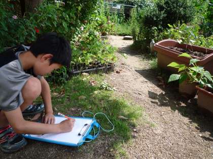 ビオトープで育てている野菜が大きくなってきたので,探検ボードを持っていき,観察しました。