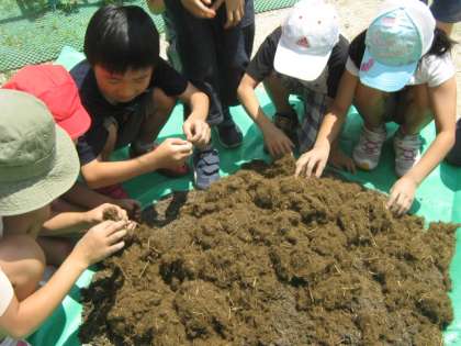 初めての経験にみんなドキドキです。けれど,ゾウから肥料をもらったことがうれしくて,一生懸命土をまぜました。