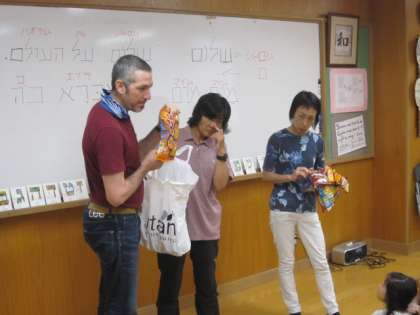 最後は、イスラエルのおやつをいただきました。めずらしいドライフルーツや日本とそっくりのスナック菓子がありました。みんなおやつが大好きで、あっという間に完食です。記念の写真を撮って、「トダ」。意味は「ありがとう」です。楽しい時間があっという間に過ぎました。