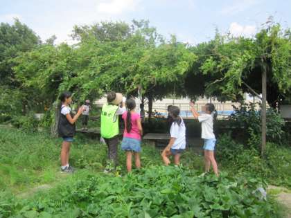 23日(水)はビオトープ園芸・作業日でした。昼休みに、まず環境委員会の子どもたちと。藤棚の枝を剪定し始めてくださいました。