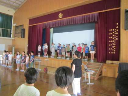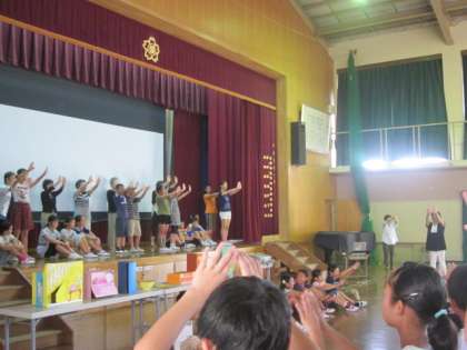 土曜日に行われる「吉田区民夏まつり」で、実行委員会のこどもたちと民生児童委員のみなさんとで、舞台発表をします。その時に、子どもたちも一緒に参加できるよう練習を全校で行いました。