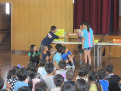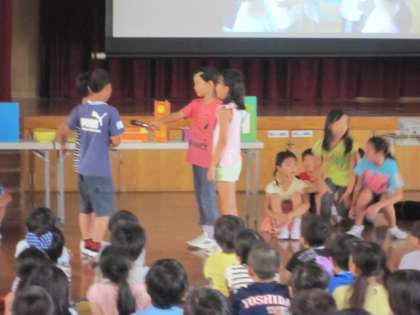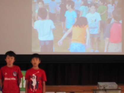 4年2組は、英語活動で取り組んだ動物が隠れている場所を当てるゲームを通して学んだことを紹介してくれました。みさきの家でもラリーの中で取り組み、朝会で実際のやり方を見せてくれてました。楽しい様子が伝わってきました。