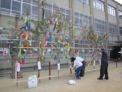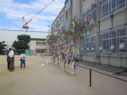 今年の夏まつりでは、京都市の「京の七夕」の事業にも取り組むということで、前日に、ささを8本運動場に飾られました。事前に、子どもたちが、願い事を書いたり、飾りをつくったりして、ささにつけておいたものです。