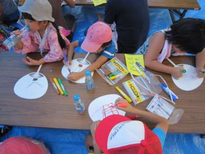 教職員の「うちわ」づくりにもたくさん子どもたちがやってきました。あれあれ、真ん中の写真に見かけたことのあるおじさんが…。そうです木下校長先生です。