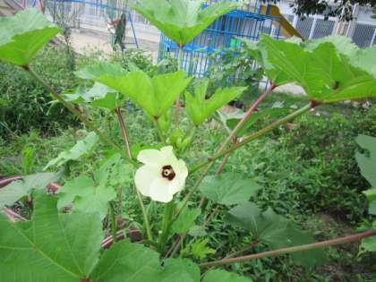 そして、やがては実になるオクラの花が美しく咲いています。