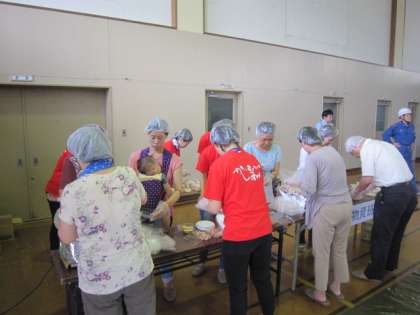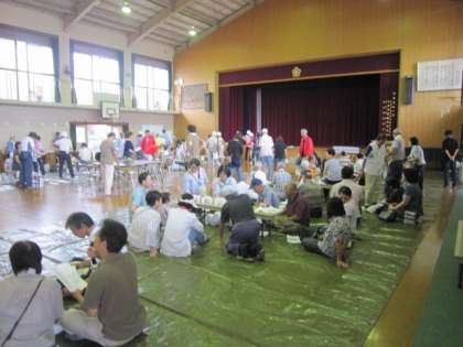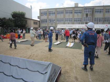 地域の消防団をはじめ、たくさんのみなさんの協力で、500名近くの人が参加して行われました。このような規模の訓練は、左京では、ここ四錦小の訓練ぐらいだと聞いています。運動場の訓練の他に、体育館では、アルファー米の炊き出しなども行われました。PTA役員さんの赤いシャツも炊き出しの作業で活躍していただきました。みなさん、お疲れ様でした。