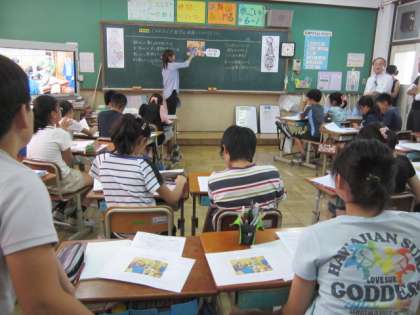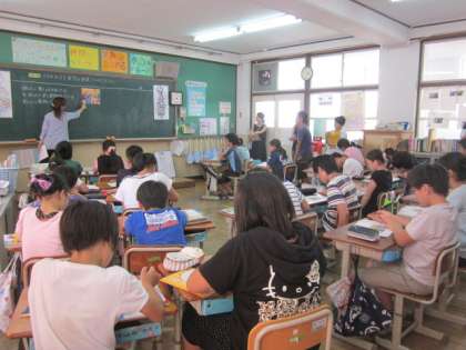 6年1組の教室で社会科の校内授業研修会を行いました。