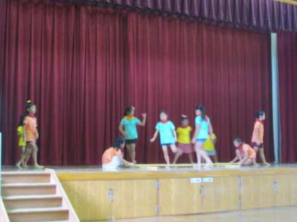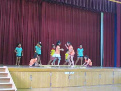 曲に合わせて、お揃いの色違いのTシャツで踊っています。