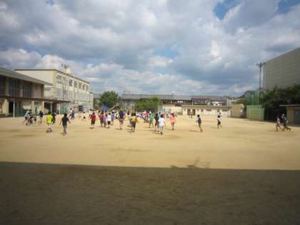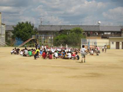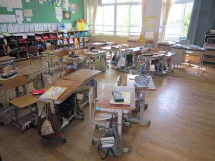 訓練の放送が入ると、運動場で一斉に子どもたちが中心に向かって走り、姿勢を低くしてじっとしていました。教室でも、先生の指示なしで、自分で机の下にもぐりこみ、しっかり訓練をして、自分の身を守っていました。