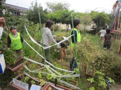 子どもたちの環境委員会もとても頑張ってくれたのですが、ビオトープボランティアのみなさんの仕事ぶりはすごいです。遊具の下にはえた草や畑をぎっしり埋めつくしていた草をとてもきれいにしてくださったり、高い高いフェンスにまで伸びたキウイの枝を切ってくださったり、玄関の枝を払ってくださったりとビックリの仕事をしていただきました。おかげで随分とさわやかになりました。
