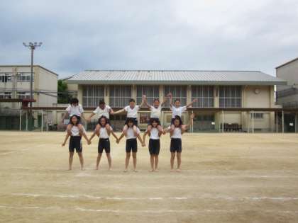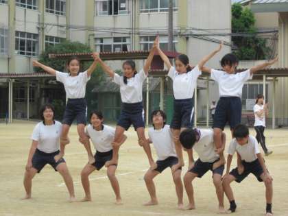 それぞれのグループが、順番にポーズを決めて運動場をまわります。