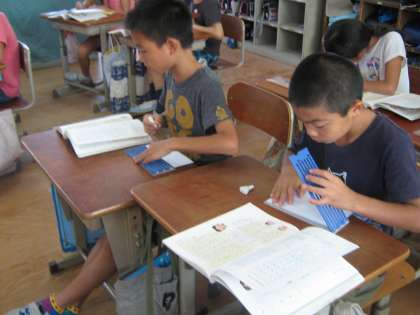 国語で「手と心で読む」の学習をしています。点字のことをもっと知りたいということになり,まずは点字をうってみました。みんな真剣なまなざしです。