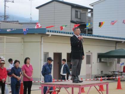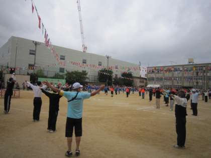 台風の影響が心配されましたが、午前9時より左京吉田地域の区民運動会が行われました。体育振興会会長・校長先生のあいさつに引き続き体操が行われ、たくさんの地域のみなさんで、にぎやかに運動会が始まりました。お天気が悪くなることが予想されるため、プログラムを短縮して、工夫して実施されました。