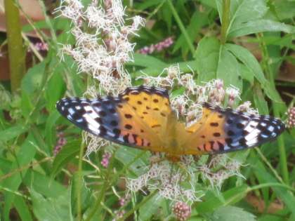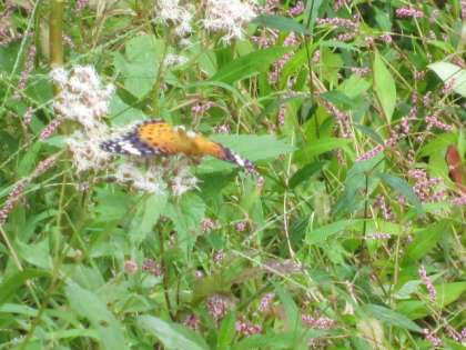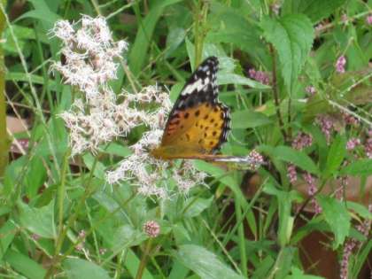 「フジバカマ」が花を咲かせていると、蝶が飛んできます。その蝶が「ツマグロヒョウモン」です。職員室の前にもしばらく置いていたフジバカマがビオトープにも花を咲かせています。今日は、そこにひらひらと、ゆっくり色鮮やかなツマグロヒョウモンが遊びに来ていました。