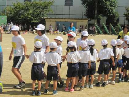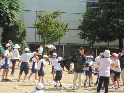 世にも珍しい珍獣、校長先生方が扮装したヘビやコウモリやワニがやってきました。珍獣にはそれぞれ玉を入れるところがあり、子どもたちはたくさんの玉を入れて珍獣たちをやっつけます。2年生も玉を渡してサポート!さいごはみんなでハイタッチ!