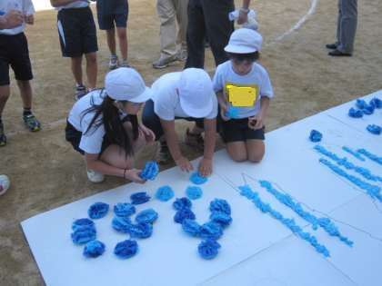 4年生といっしょにお花を運んで大きな紙に貼りつけます。すると最後は大きなお城と「ありがとう」の文字に!仲良く花を運ぶ時にはスピードに気をつけないと花が落ちてしまいます。二人で早さを合わせるのも、協力することですね。