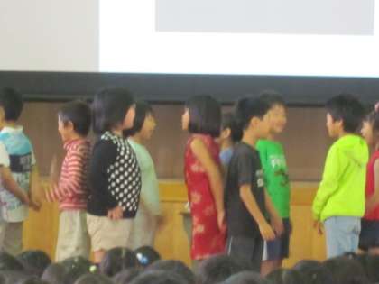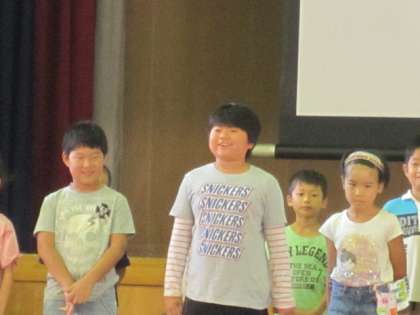 2年2組の朝会発表は、とても元気にお話してくれました。英語のチャンツをみんなでリズムよくやってくれて、最後は英語が大好きだということがよく分かることを、代表の何人かが話してくれました。