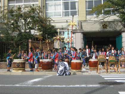 和太鼓部の学校前での発表の様子です。
