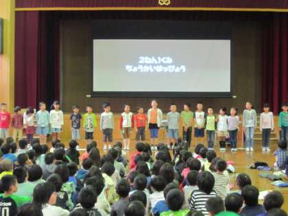 2年生の発表は、楽しい歌をいっぱい取り入れながらしてくれました。大事にしている笑顔がいっぱいでした。1年生の子どもたちも思わずいっしょに、歌に合わせて手を動かせていました。