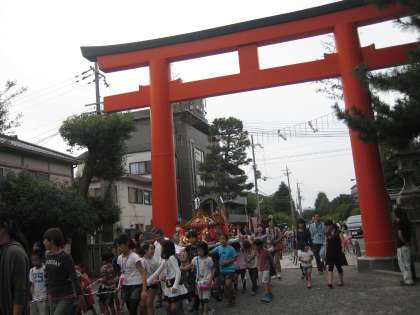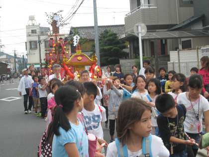 中大路町で2回目の発表の後,剣鉾部の子ども達は,吉田神社まで剣鉾を差して歩き,和太鼓部の子ども達は,子ども神輿を担いで吉田神社へ戻りました。