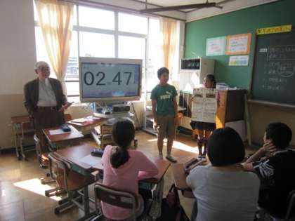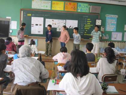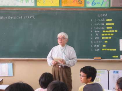 6年生は、総合的な学習の時間に京大博物館の展示の中から自分の興味をもったことについて調べ、人に分かりやすく伝えることをめあてにまとめて表現しています。今日は、博物館の館長さんに教室まで来ていただいて、自分の調べたことを発表しました。詳しく調べたことを、館長さんからもほめていただいたり、これからの活動のヒントをいただいたりしました。
