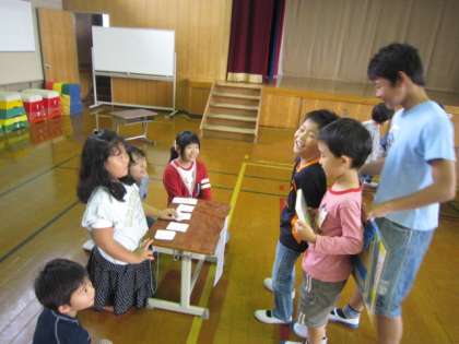 2時間目のにこにこイングリッシュは1年・3年・6年生でした。1年生と3年生は6年生のお兄さんお姉さんにいろいろ助けてもらいながら、楽しい時間を過ごしていました。6年生は、下の学年の子どもたちに優しく関わり、グループをまとめながら英語のやりとりを楽しんでいました。