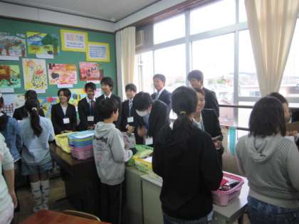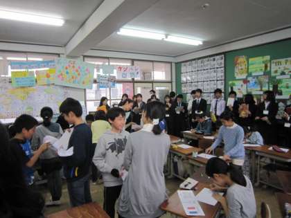 3時間目には、2年生に引き続いて6年生の外国語活動の授業を参観してもらいました。授業では、子ども同士のやりとりの後に、行きたい国を子どもたちがたくさんの学生に直接尋ねる場面も設定してあり、初対面の子どもたちは、うれしそうに英語でやりとりを楽しんでいました。「実際に役立つ会話ができている」と、学生たちの驚きの感想も聞かれました。
