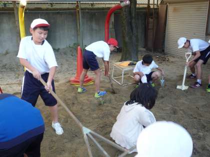 その後,運動場へ向かい,5年2組の友だちと一緒にスコップを使って走り幅跳びの場所の土ならしをしました。