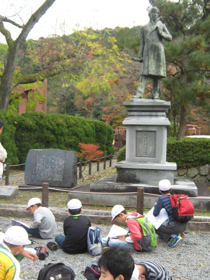 石碑に刻まれた言葉を読もうとしている子どもたちもいました。漢文で難しかったのですが,「産業振興のため」「工部大学校田辺朔郎君」などを見つけていました。
