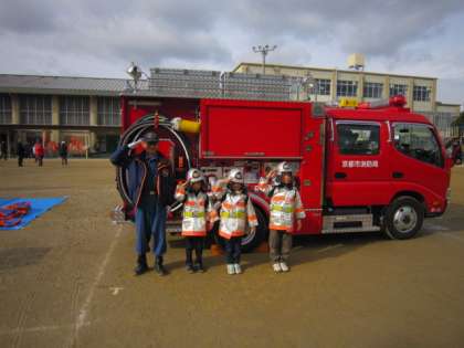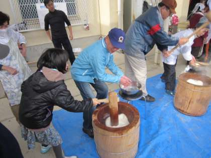 子どもたちも、実際に起振車に乗って体験したり、お餅つきをしたりしました。消防隊に変身した、うれしそうな顔も見られました。